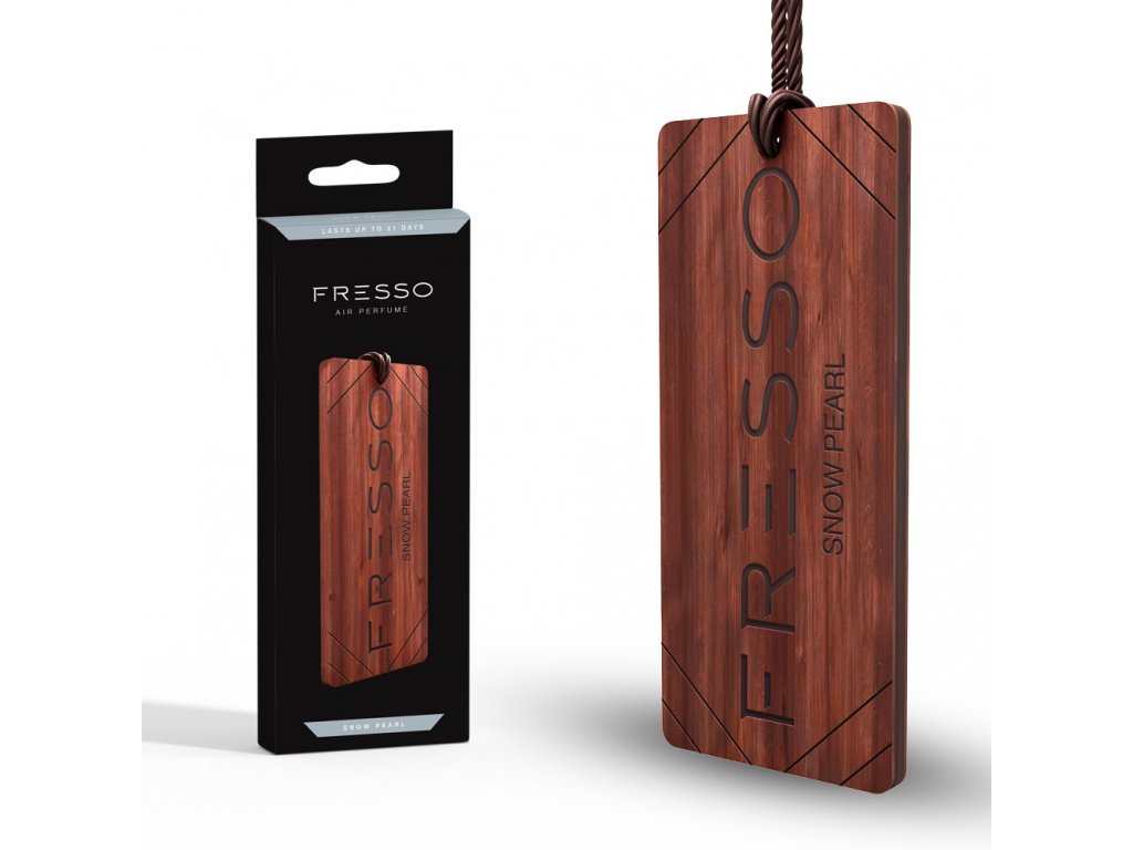 Elegantní dřevěný přívěsek s vůní "Snow Pearl", který se dá pověsit za koženou pletenou šňůrku na zpětné zrcátko v autě. Jedná se o sofistikované příslušenství, které dokonale ladí s jakýmkoliv interiérem vozu. Přívěsek Fresso vás překvapí, protože má výjimečnou podobu a jeho vůně je trvanlivá a důmyslně složená. Vzhledem k přírodnímu původu se přívěsky mírně liší vzhledem a zároveň vytvářejí výjimečnou atmosféru ve vašem autě. Jedinečný recept vůní Fresso je založen na hodnotných složkách, které jsou geniálně sestaveny. Tato vůně pak dokáže vonět až 31 dnů. Jemné vonné tóny Fresso se uvolňují průběžně a kontrolovaně. Nehrozí ze začátku žádná přehnaně intenzivní vůně, která je mnohdy až obtěžující, jak tomu často bývá u ostatních vůní do auta. Vůně zůstává stabilní téměř po celou dobu použití přívěsku.