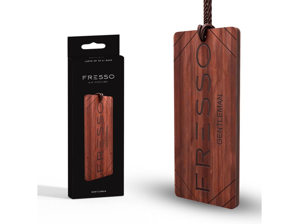 Elegantní dřevěný přívěsek s vůní "Gentleman", který se dá pověsit za koženou pletenou šňůrku na zpětné zrcátko v autě. Jedná se o sofistikované příslušenství, které dokonale ladí s jakýmkoliv interiérem vozu. Přívěsek Fresso vás překvapí svojí výjimečnou podobou a vůní, která je trvanlivá a důmyslně složená. Vzhledem k přírodnímu původu se přívěsky mírně liší vzhledem a zároveň vytvářejí výjimečnou atmosféru ve vašem autě. Jedinečný recept vůní Fresso je založen na hodnotných složkách, které jsou geniálně sestaveny. Tato vůně pak dokáže vonět až 31 dnů. Jemné vonné tóny Fresso se uvolňují průběžně a kontrolovaně. Nehrozí ze začátku žádná přehnaně intenzivní vůně, která je mnohdy až obtěžující, jak tomu často bývá u ostatních vůní do auta. Vůně zůstává stabilní téměř po celou dobu použití přívěsku.