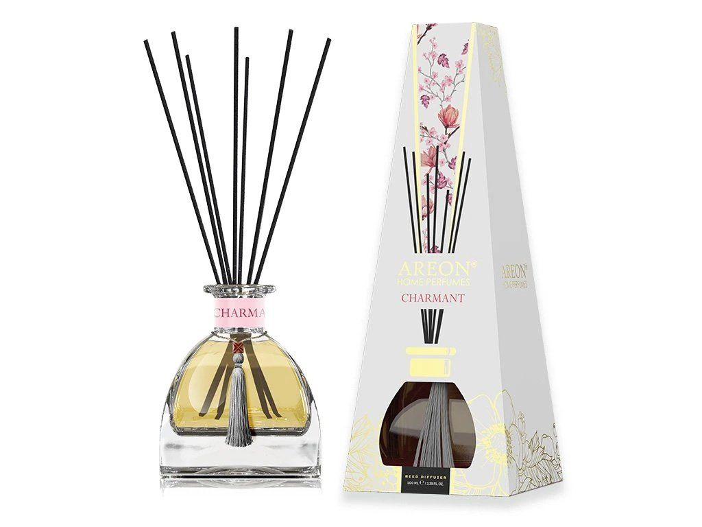 AREON HOME PERFUME Charmant je prémiový interiérový parfém pro ty, kteří chtějí svému prostoru dodat harmonii, útulnost a nádech luxusu. Elegantní skleněná lahvička doplněná černými dřevěnými tyčinkami zajišťuje rovnoměrné a dlouhodobé uvolňování vůně do okolí. 🌿
